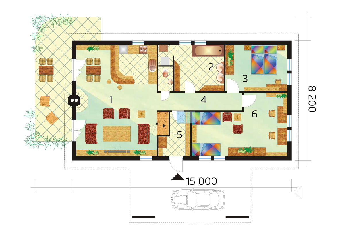Projekt parterowego prefabrykowanego domu ceramicznego z dwiema dużymi lub trzema mniejszymi sypialniami. Nad salonem można stworzyć galerię oświetloną oknami umieszczonymi w ścianie szczytowej. Korpus komina na zewnątrz domu będzie dominujący, ale nie będzie to plan terenu.