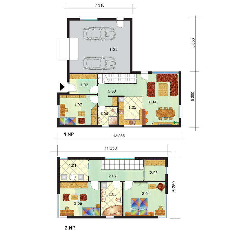 Projekt dwukondygnacyjnego nowoczesnego domu z podwójnym garażem. Dom rodzinny dla rodziny wielorodzinnej, rodziny z dziećmi lub par, które lubią prywatność w wielkim stylu. Charakteryzuje się doskonałym układem, ponieważ dolna część domu jest zarezerwowana dla przestronnego salonu połączonego z kuchnią. Ten energooszczędny dom wolnostojący ma do trzech sypialni. Na parterze jest także jedna z sypialni. Pokój ten może być wykorzystywany jako pokój gościnny lub biurowy lub po prostu jako gabinet, podczas gdy pozostałe dwie sypialnie znajdują się na pierwszym piętrze, na którym znajduje się również duża łazienka. Zaletą domu jest również bogato zaprojektowany podwójny garaż.