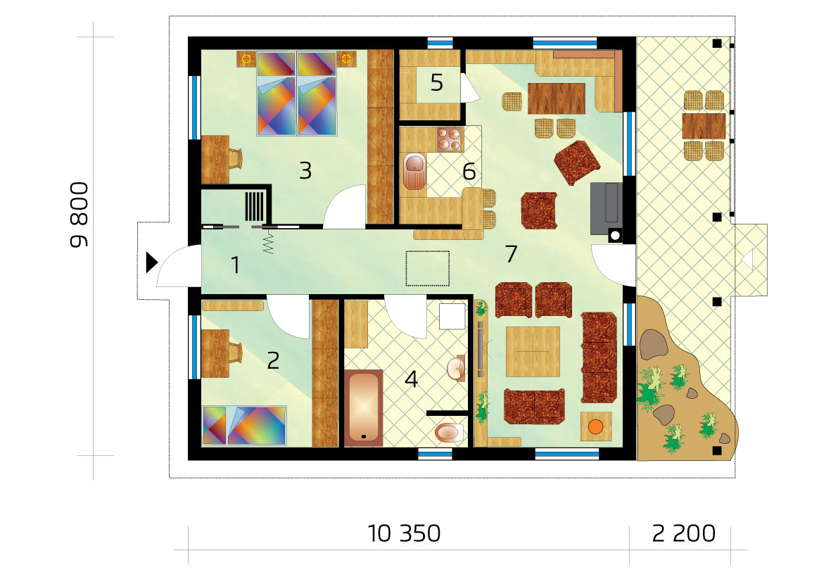 Dwupokojowy projekt bungalowu o kwadratowym kształcie. Przestronny korytarz prowadzi do dwóch sypialni, łazienki do salonu z kuchnią. Duże francuskie okna z widokiem na cały dom zostaną również docenione podczas picia porannej kawy na tarasie. Nic nie umknie i będziesz miał widok na cały dom. Taras można dostosować do działki i głównych kierunków.