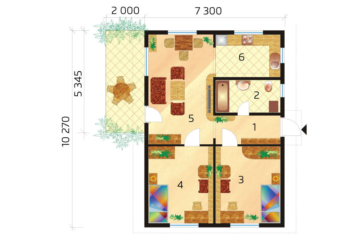 Plan piętra dwupokojowego domku nadającego się na wąską działkę. Dom nr 14 to mniejszy dom rodzinny, sprytnie i prosto zaprojektowany. Nadaje się do płaskiego terenu i łagodnego stoku. Jest energooszczędny, z maksymalnie wykorzystaną zabudowaną i użyteczną powierzchnią. Nadaje się również jako domek ogrodowy, pensjonat lub dom weekendowy.
